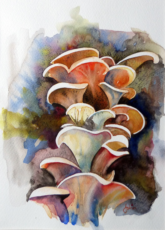 The colour and form of some unusual fungi on a tree branch near Port Allen has inspired new ideas for sculpture and watercolours and that together with a series of studies of castle buildings, informs John’s current practice.